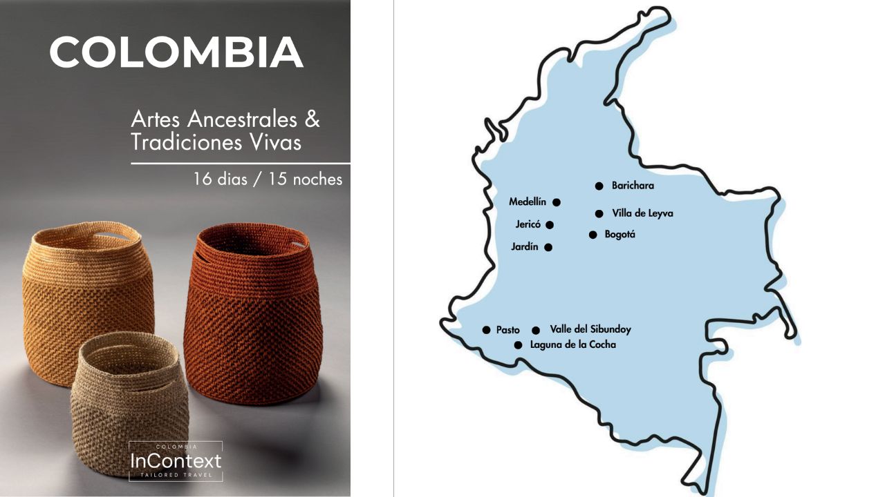 Esta ruta propone una manera especialmente rica de descubrir Colombia: a través de los oficios, los materiales y los saberes que siguen dando forma a su identidad cultural. Desde la escena creativa de Bogotá y sus talleres patrimoniales, hasta los maestros artesanos de Barichara, la cultura del diseño en Medellín, las tradiciones de flores, cuero y café en Jericó y Jardín, y los universos indígenas de Nariño y el Valle del Sibundoy, este recorrido revela una Colombia donde la artesanía no pertenece solo al pasado, sino que sigue viva en la vida cotidiana. Es un viaje por conocimientos transmitidos de generación en generación, paisajes hermosos y expresiones culturales profundamente arraigadas, pensado para viajeros que valoran la autenticidad, la belleza y los encuentros con verdadero contenido.